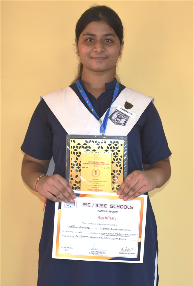 Nandini Agnihotri of clas 11-B secured 1st Rank in North Zone (Inter Shool Hindi Creative Writing Competition) organised by Dr.Virendra Swarup Public School Cantt., Kanpur